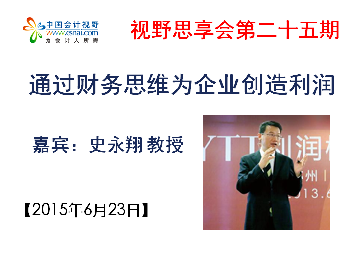 史永翔 教授, YTT(中国)顾问有限公司总裁,北京大学汇丰商学院EDP 前教务长,曾担任多家大型外资企业、跨国企业的市 场总监、财务总监、运营总监、中国区总裁等职务;著有《利润:企业利润持续增长之道》、《向经营要利润》、《向财务要利润》等畅销书。